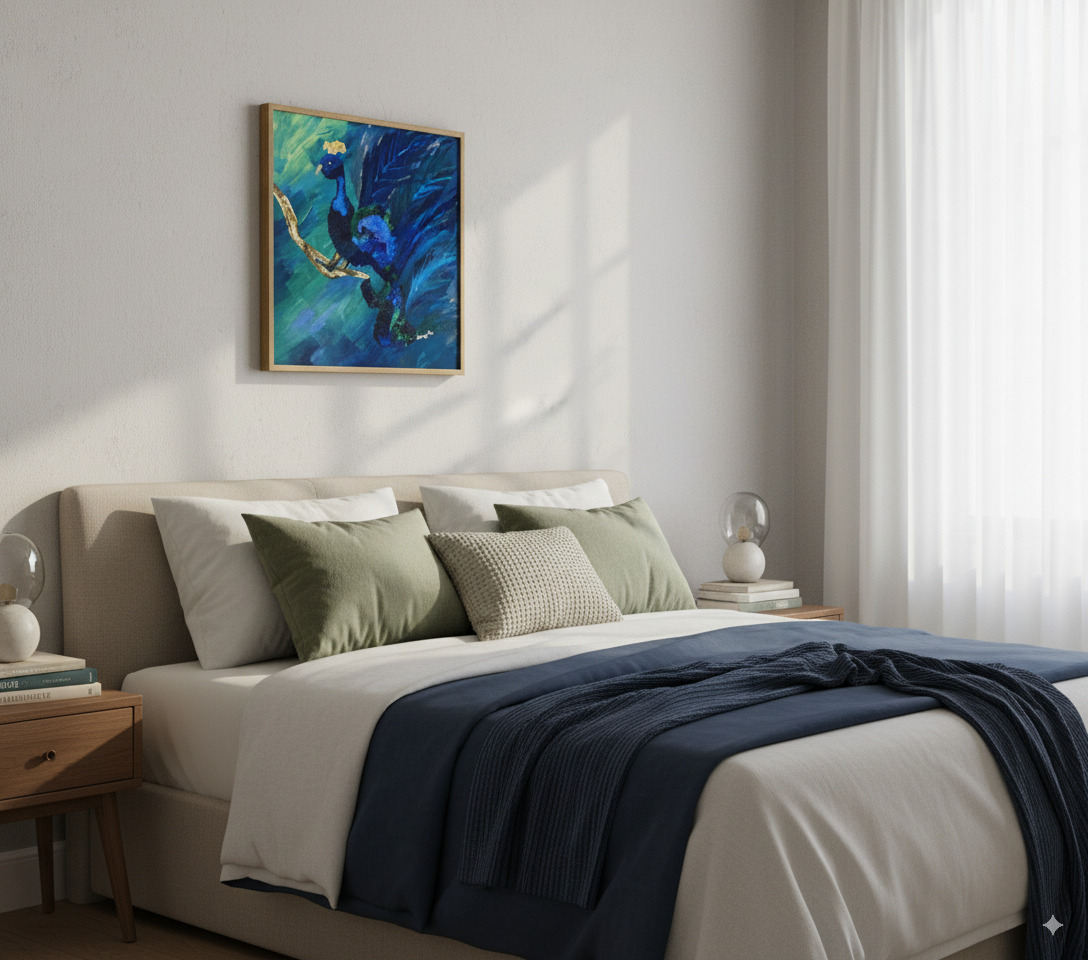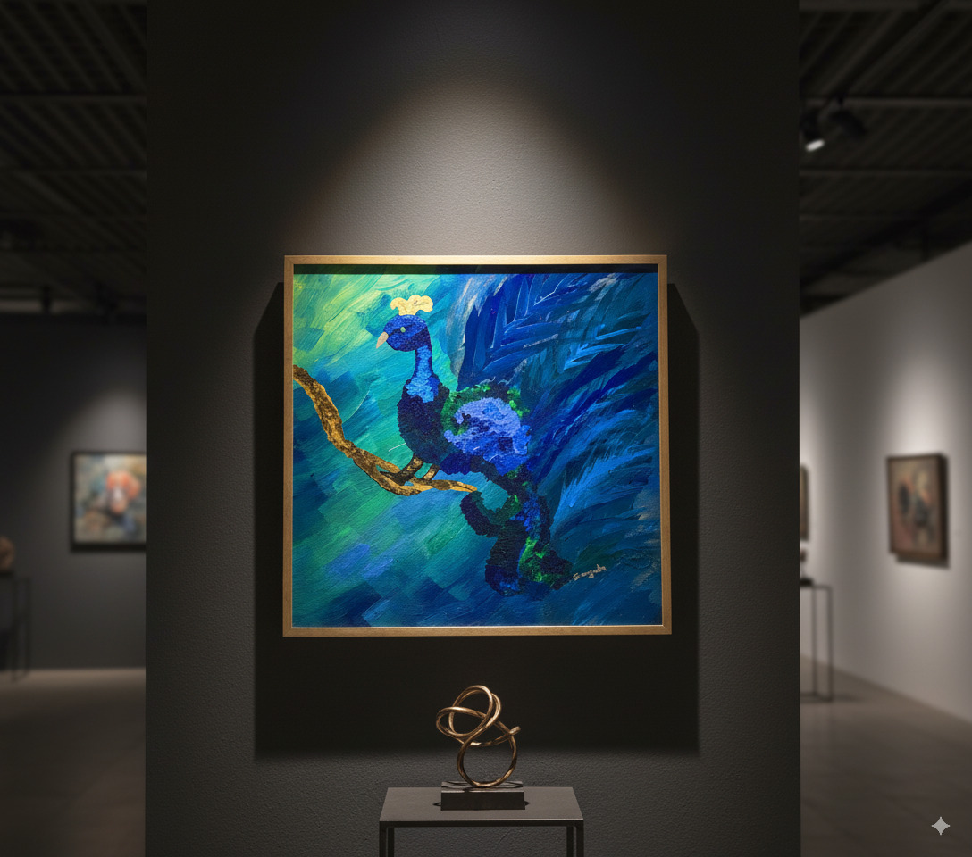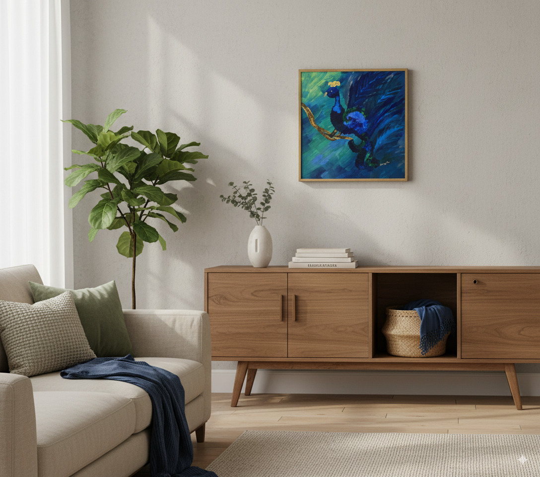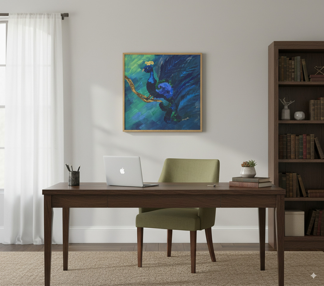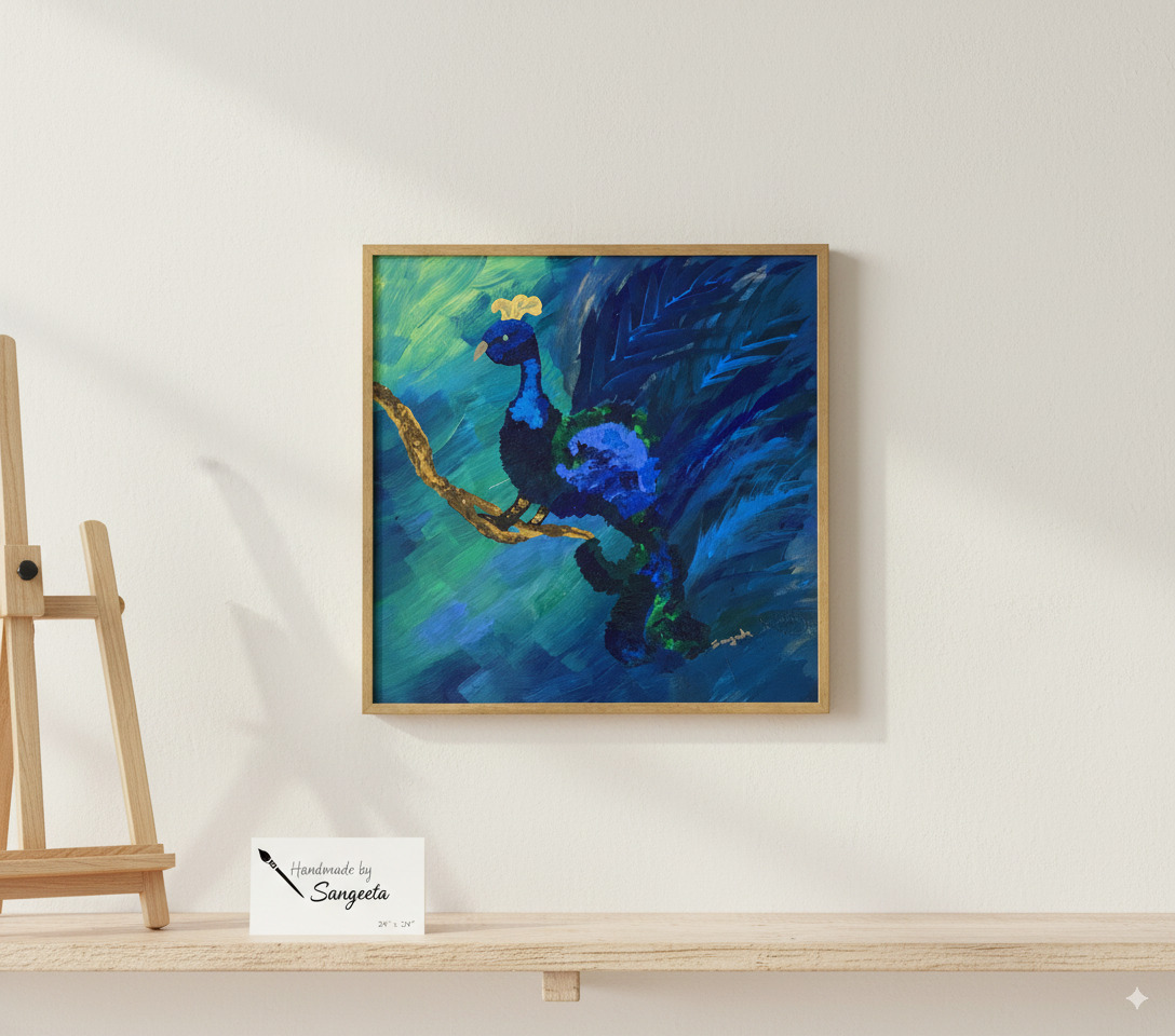 Immerse your space in the opulent beauty of “Azure Majesty.” This captivating original painting brings the majestic peacock to life through a dynamic interplay of color and texture. With bold Peacock Canvas Art, confident brushstrokes, artist Sangeeta has crafted a scene that is both powerful and elegant.