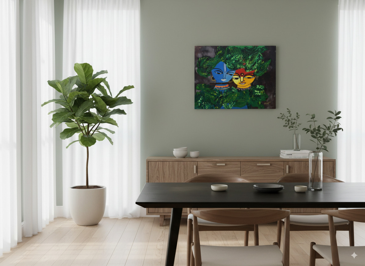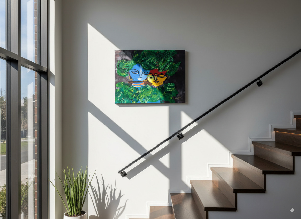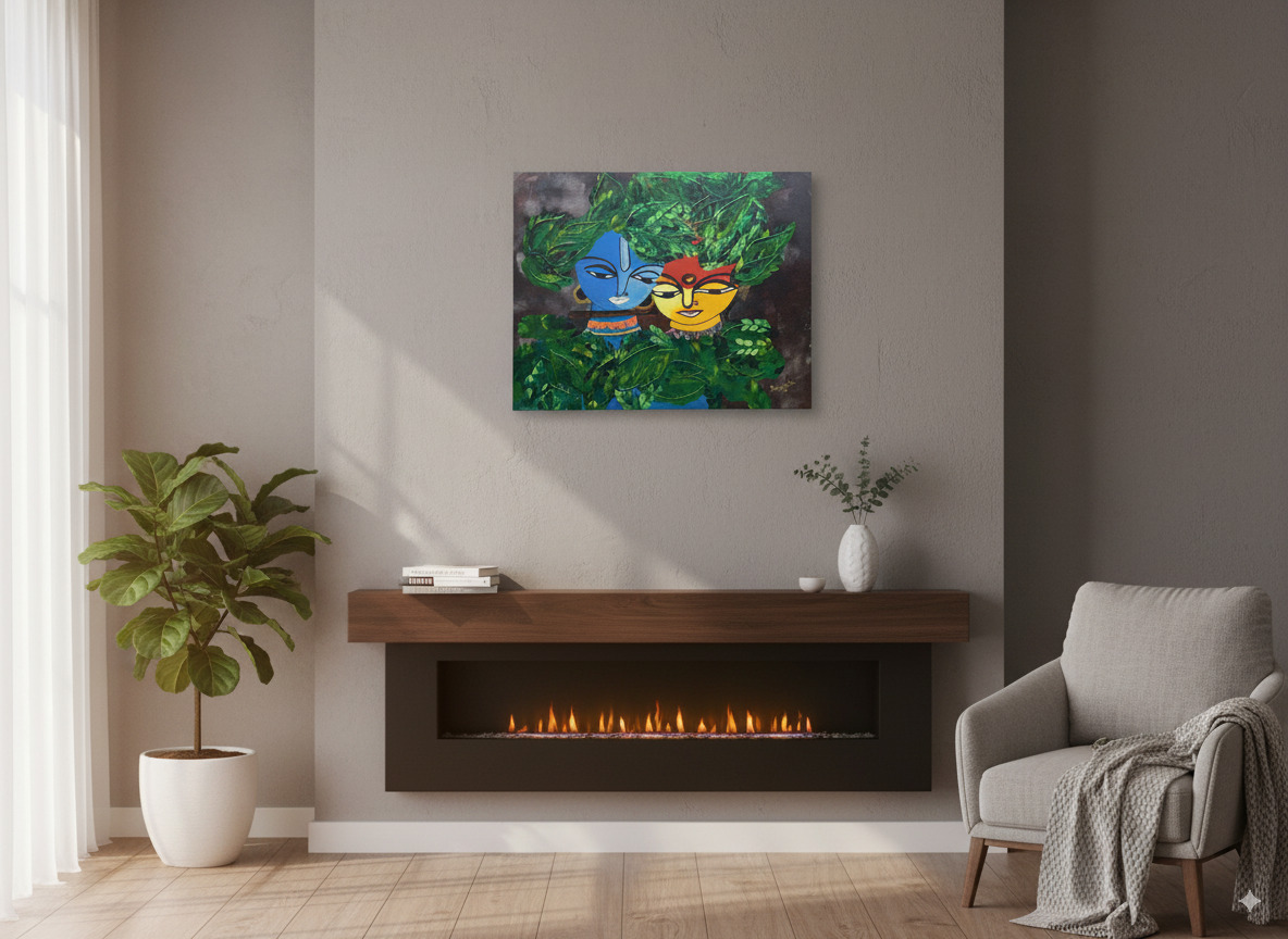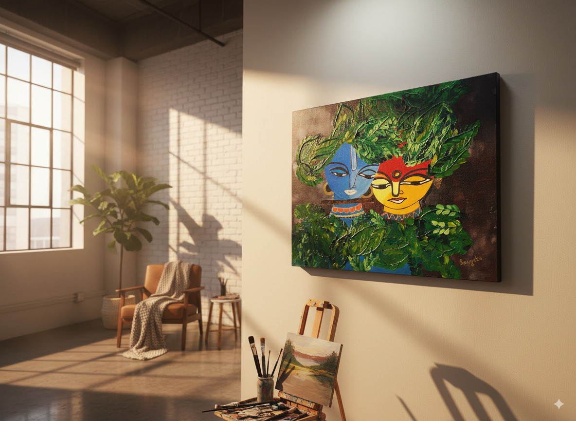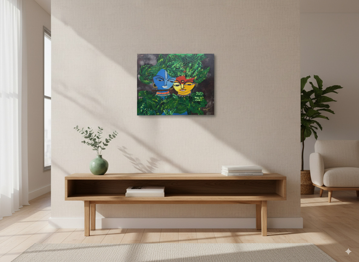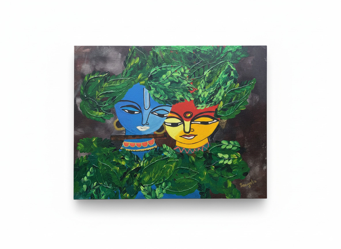 What sets this painting apart is its extraordinary texture. The leaves surrounding Radha and Krishna are sculpted with thick, tactile strokes of paint, creating a tangible sense of depth and life. You can feel the energy of the forest and the protective canopy under which their love blossoms. Krishna’s iconic blue skin contrasts beautifully with Radha’s sun-kissed radiance, a symbolic representation of the union of the divine masculine and feminine energies.