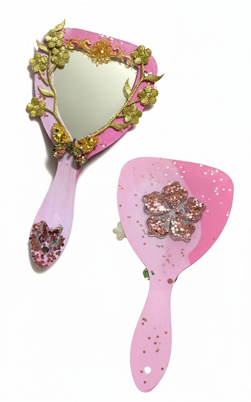 The Enchanted Front: Gaze into a high-quality mirror framed by delicate golden vines that seem to grow around its edges. At its base, a shimmering butterfly with jeweled wings has come to rest, adding a touch of fairytale charm. The handle is finished with a soft pink ombré, sprinkled with stardust glitter.