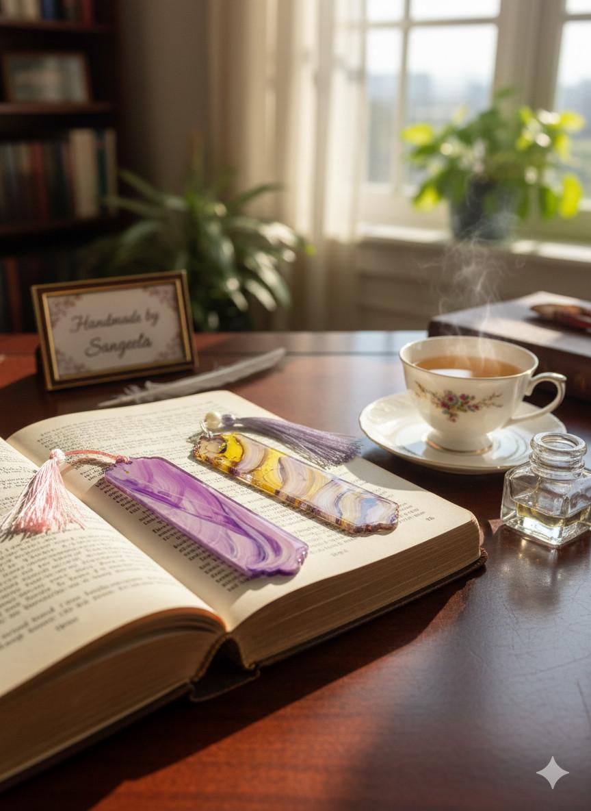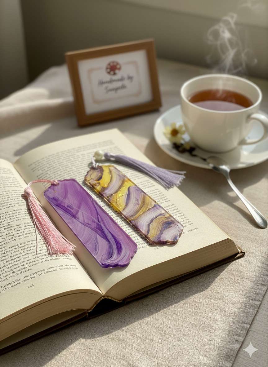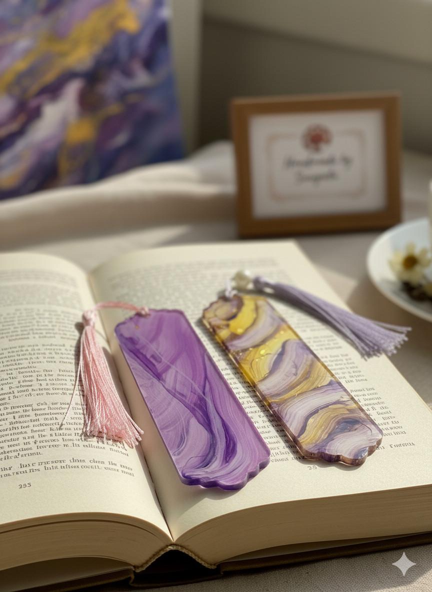 These are more than just bookmarks; they are functional art. I, Sangeeta, personally mix high-quality pigments into durable, crystal-clear acrylic resin. The fluid patterns are created through a meticulous pouring technique, resulting in a unique, one-of-a-kind design in every single piece. They are then carefully cured, sanded, and polished to a glass-like finish that feels wonderful to the touch.