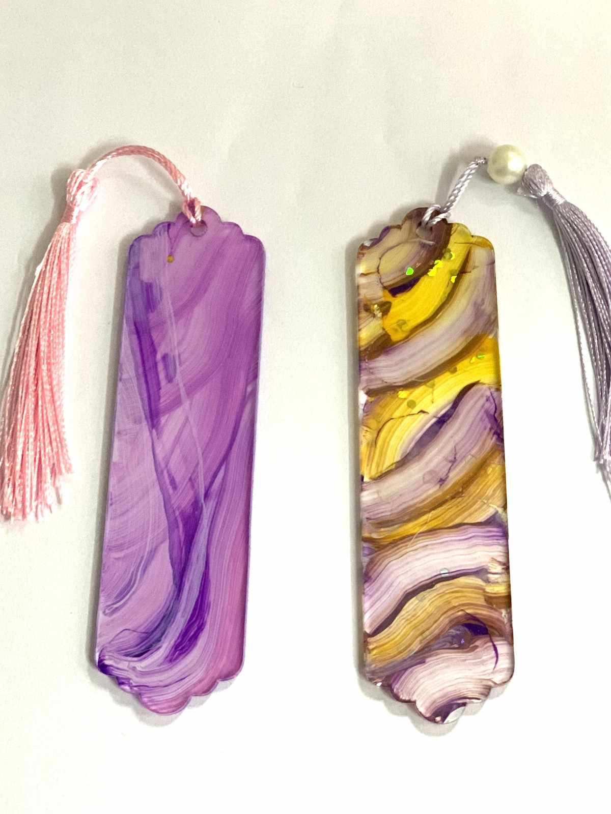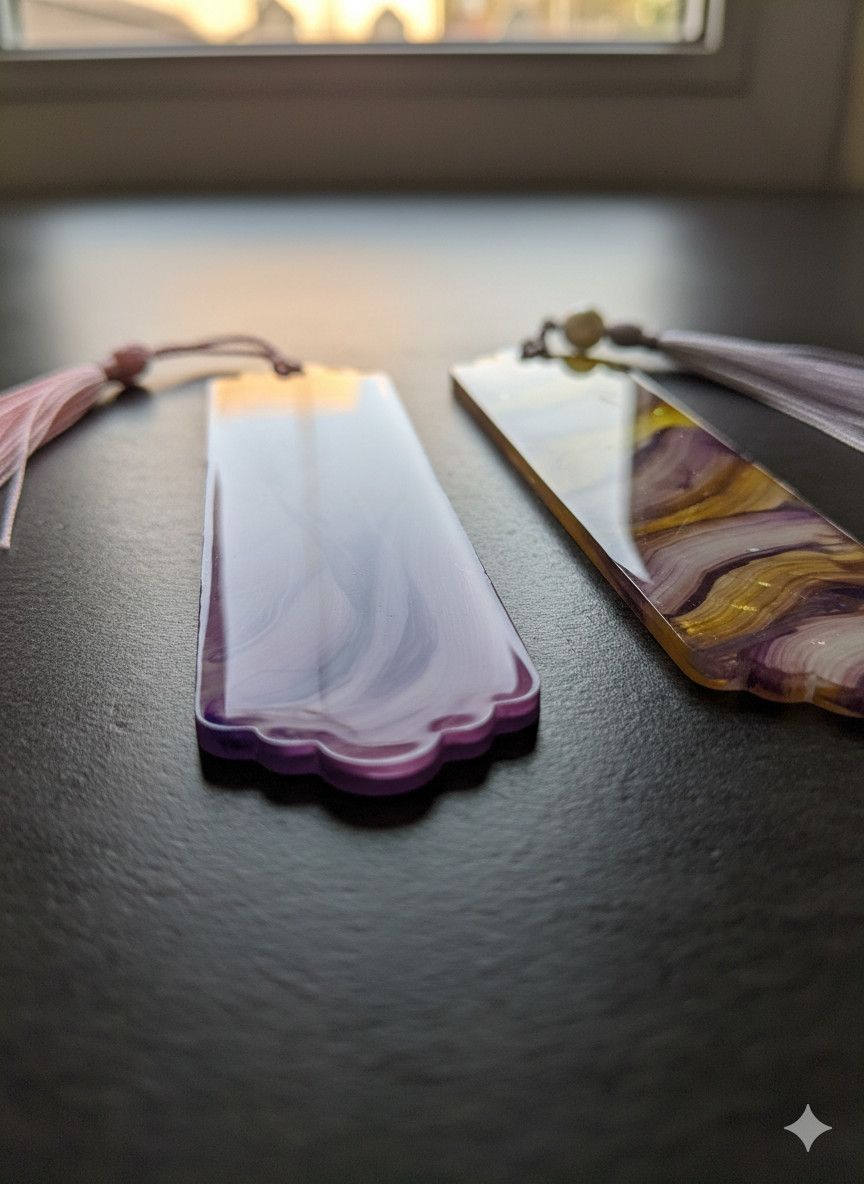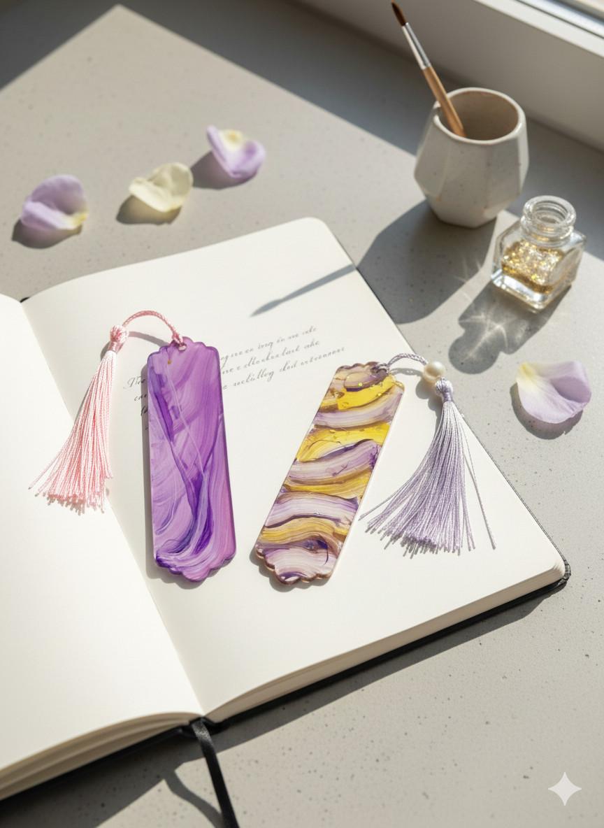 These are more than just bookmarks; they are functional art. I, Sangeeta, personally mix high-quality pigments into durable, crystal-clear acrylic resin. The fluid patterns are created through a meticulous pouring technique, resulting in a unique, one-of-a-kind design in every single piece. They are then carefully cured, sanded, and polished to a glass-like finish that feels wonderful to the touch.