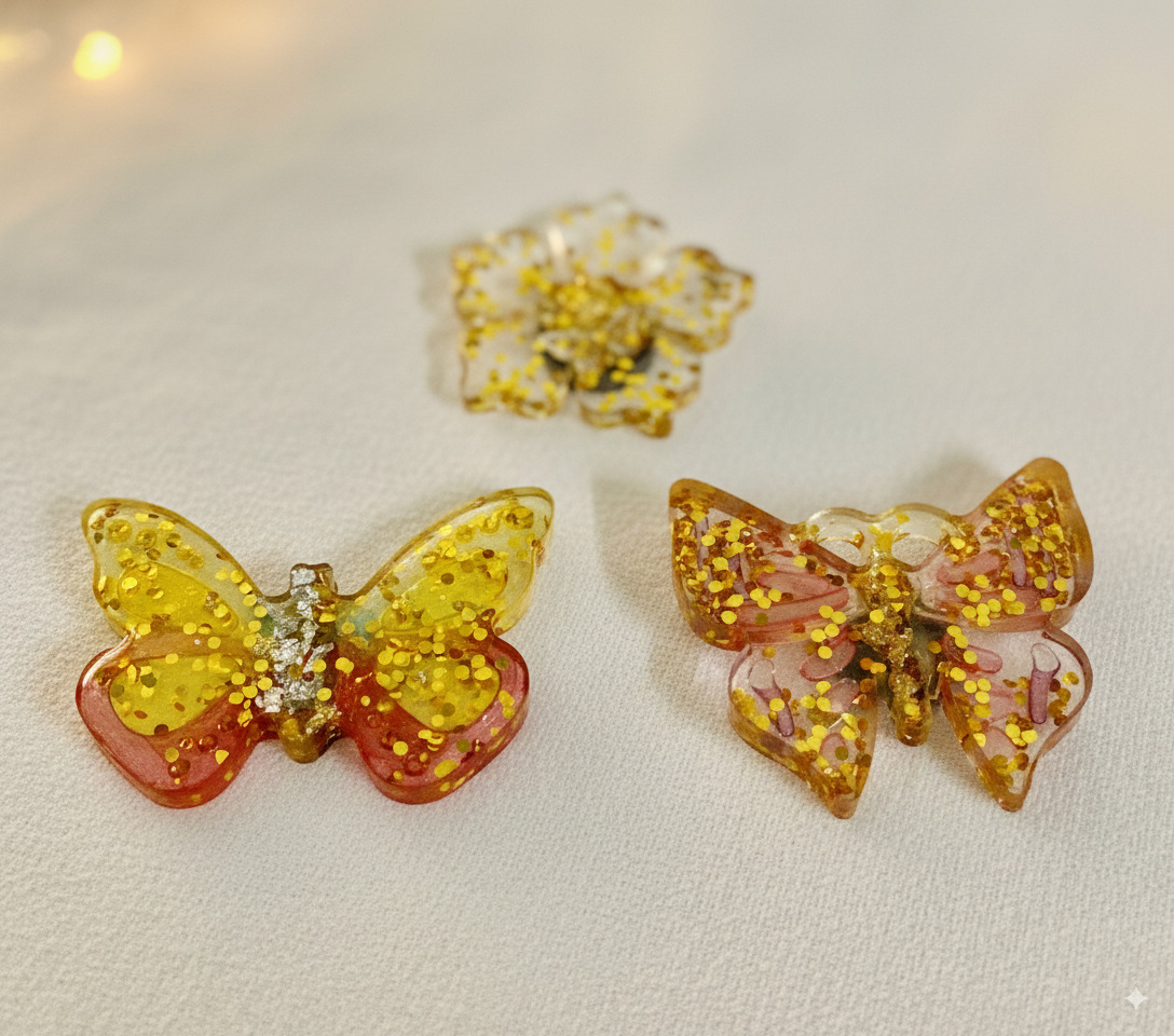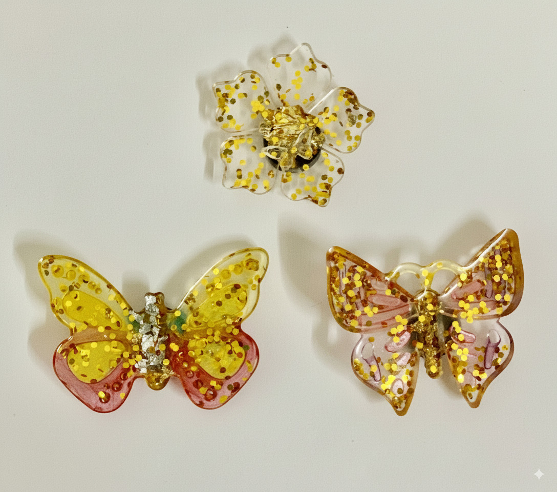 Add a touch of magic to your space! This beautiful set of 3 unique, handmade resin butterfly & Flower Fridge Magnets is bursting with vibrant colors and sparkling glitter. Each piece is crafted with care, perfect for decorating your fridge, locker, or office whiteboard. Brighten up any magnetic surface!