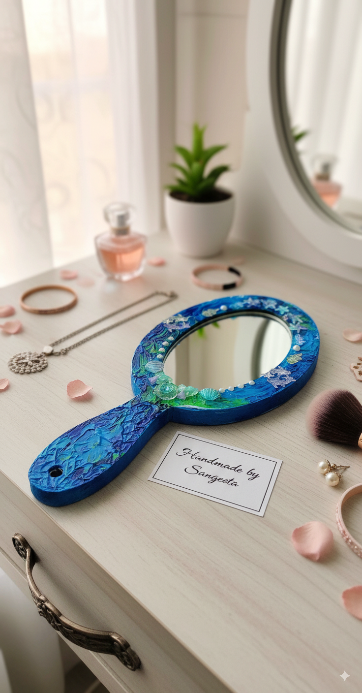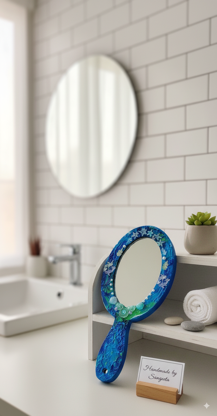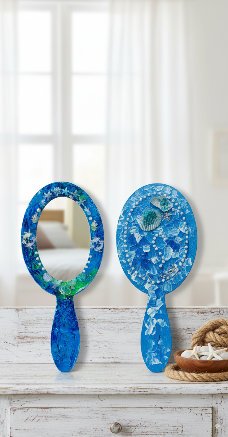 Whether resting on your dressing table, displayed on a shelf, or used in your morning routine, this hand-painted mirror adds a touch of bespoke elegance to any space. It’s a perfect statement piece for coastal, bohemian, or mermaid-themed decor.