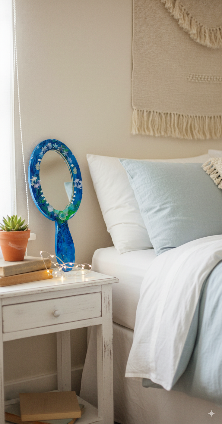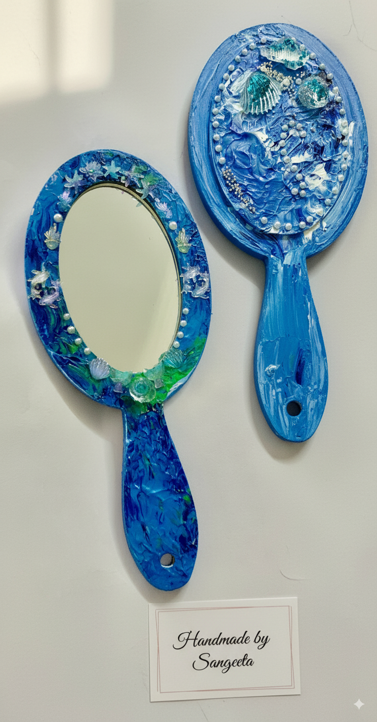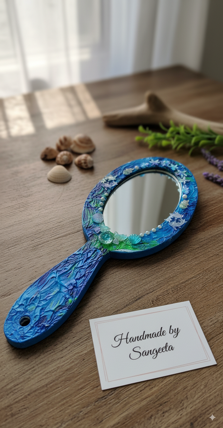 Whether resting on your dressing table, displayed on a shelf, or used in your morning routine, this hand-painted mirror adds a touch of bespoke elegance to any space. It’s a perfect statement piece for coastal, bohemian, or mermaid-themed decor.