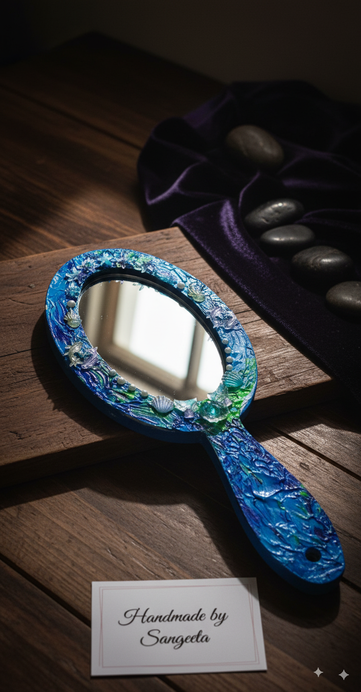 Immerse yourself in the magic of the sea with “The Siren’s Reflection,” a breathtaking handmade ocean mirror created with passion by artist Sangeeta. This isn’t just a mirror; it’s a functional piece of art designed to bring the calming and mystical energy of the coastline into your home.