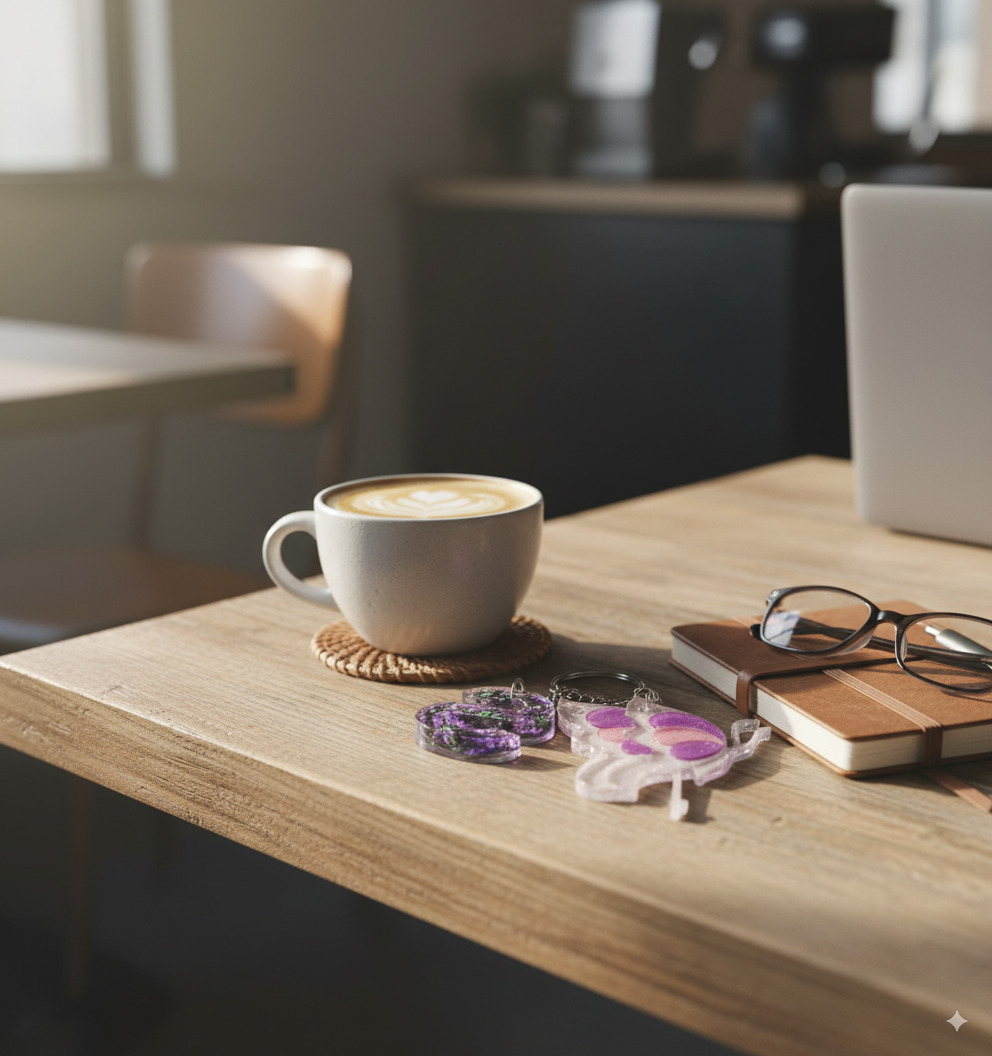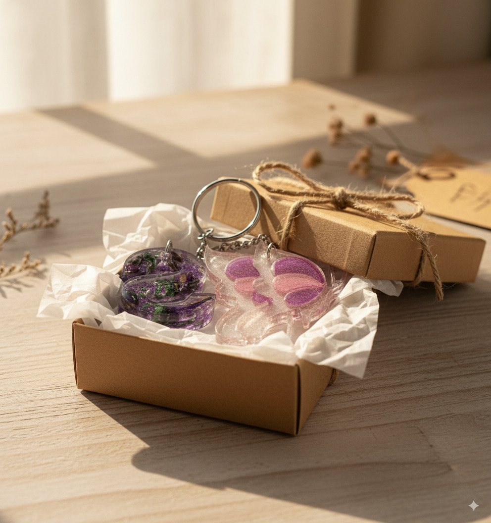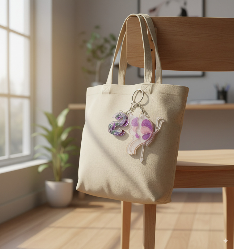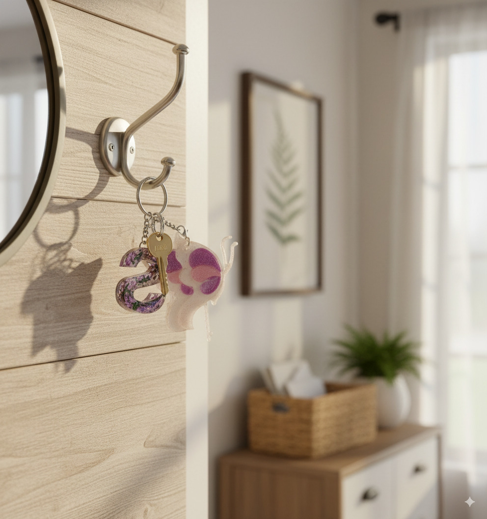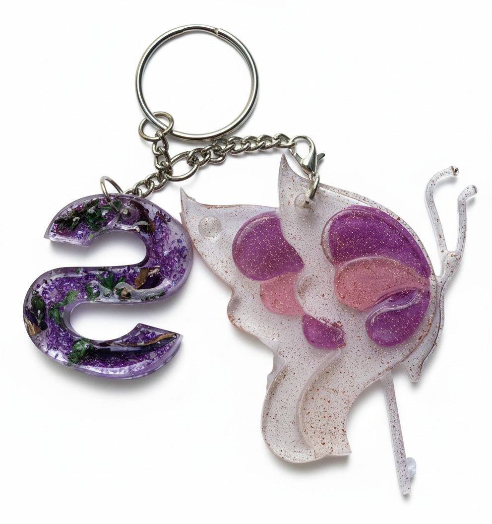 This exquisite accessory features two distinct yet harmonious charms. The first is a bold letter ‘S’, cast in a deep, enchanting purple resin and filled with real dried botanicals and fine glitter, like a secret garden captured in time . Paired with it is a magnificent butterfly , its delicate wings shimmering with shades of sparkling purple and pink against a translucent, glittering body. It’s a perfect symbol of personal growth and natural beauty.