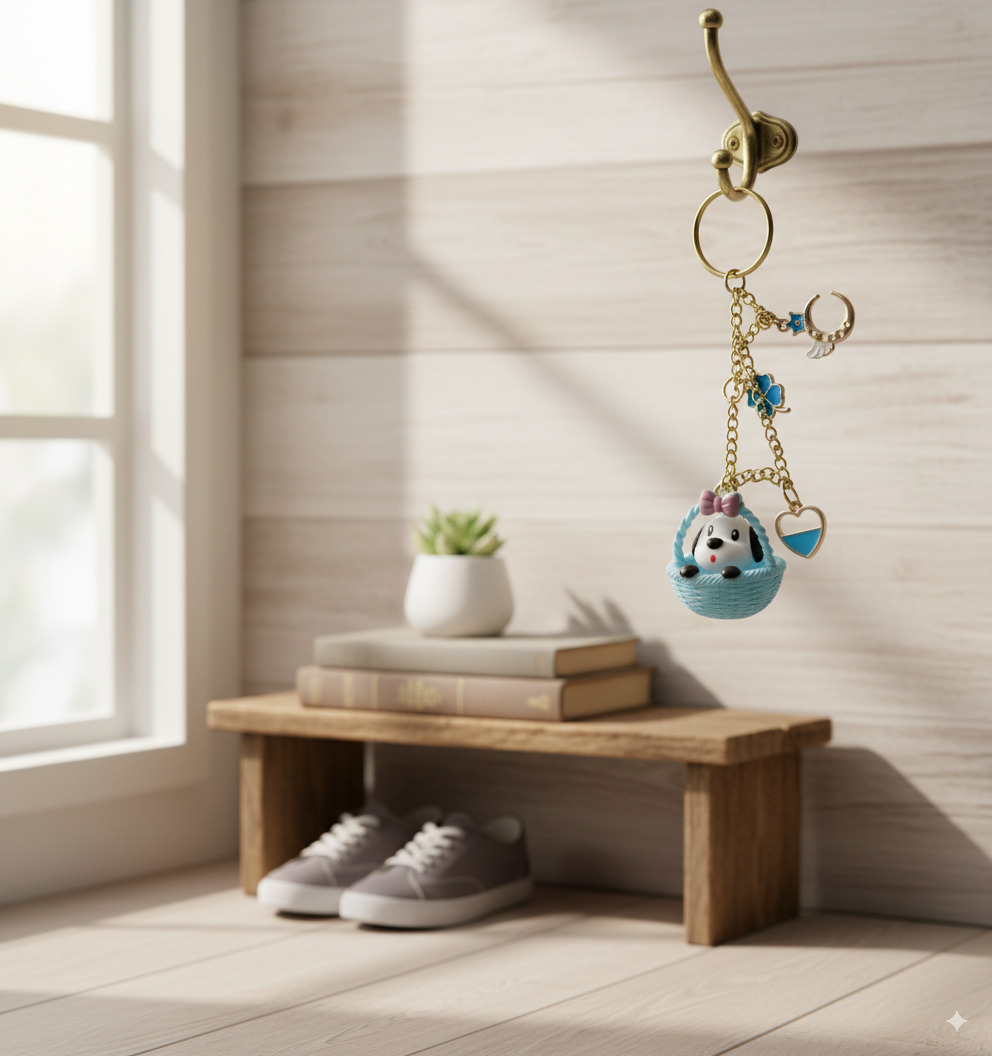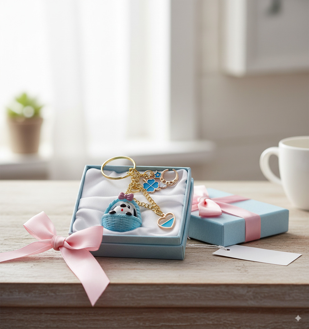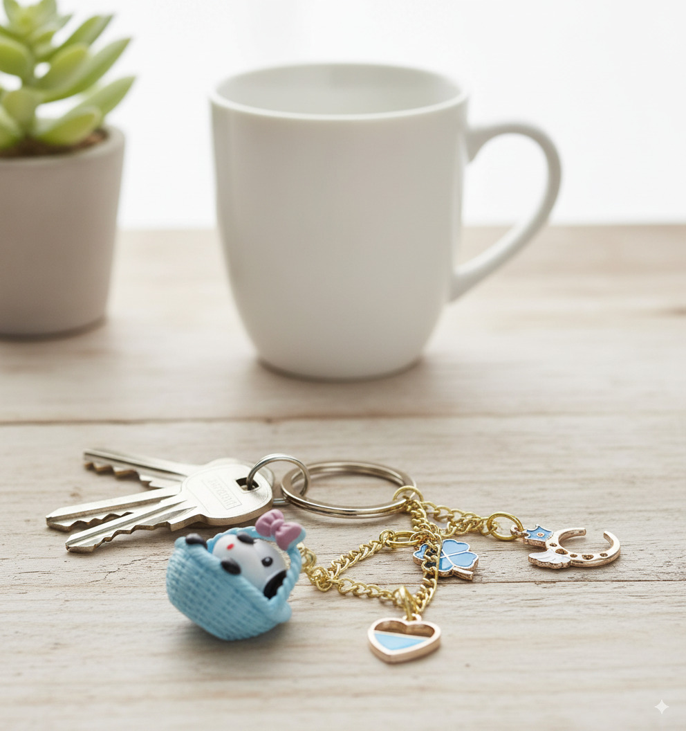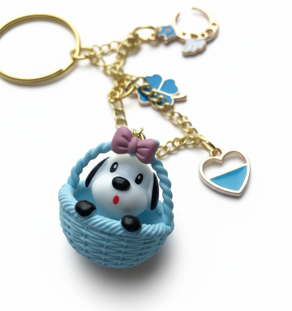 Our star is a sweet little puppy , complete with a pretty pink bow, nestled safely in its favorite blue basket . But this pup doesn’t travel alone! It’s accompanied by a collection of beautiful good luck charms: a celestial winged moon for sweet dreams , a four-leaf clover for good fortune , and a lovely blue heart for love and friendship ❤️. It’s a whole story on a keychain!