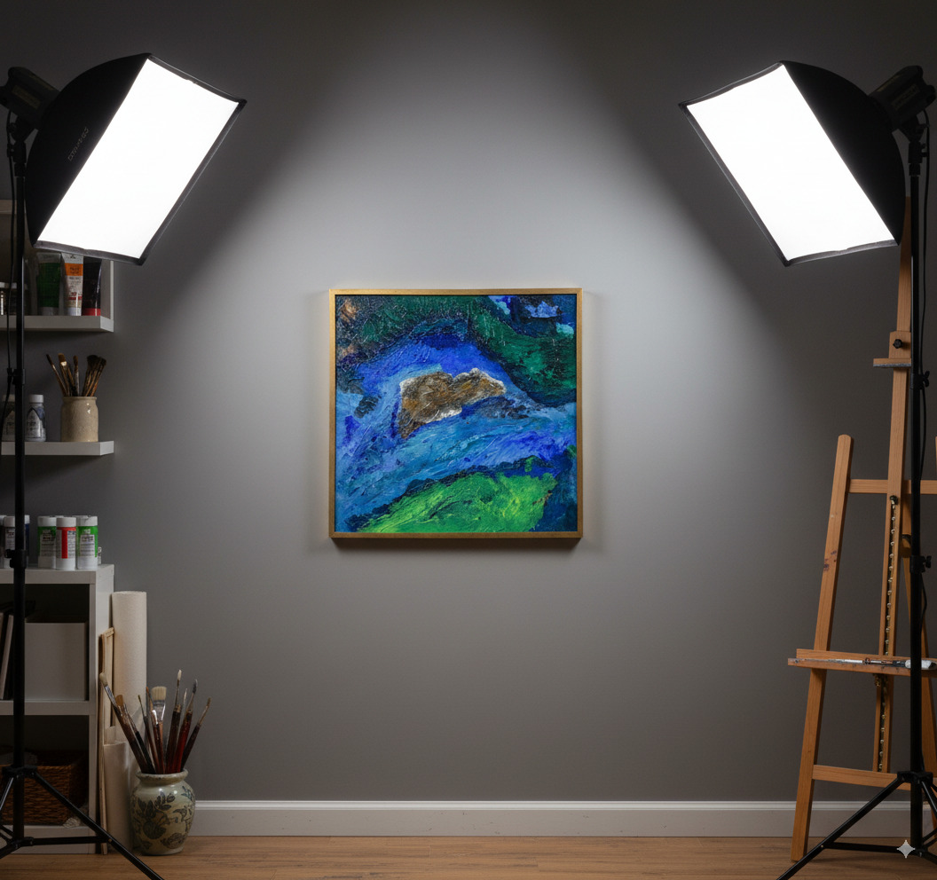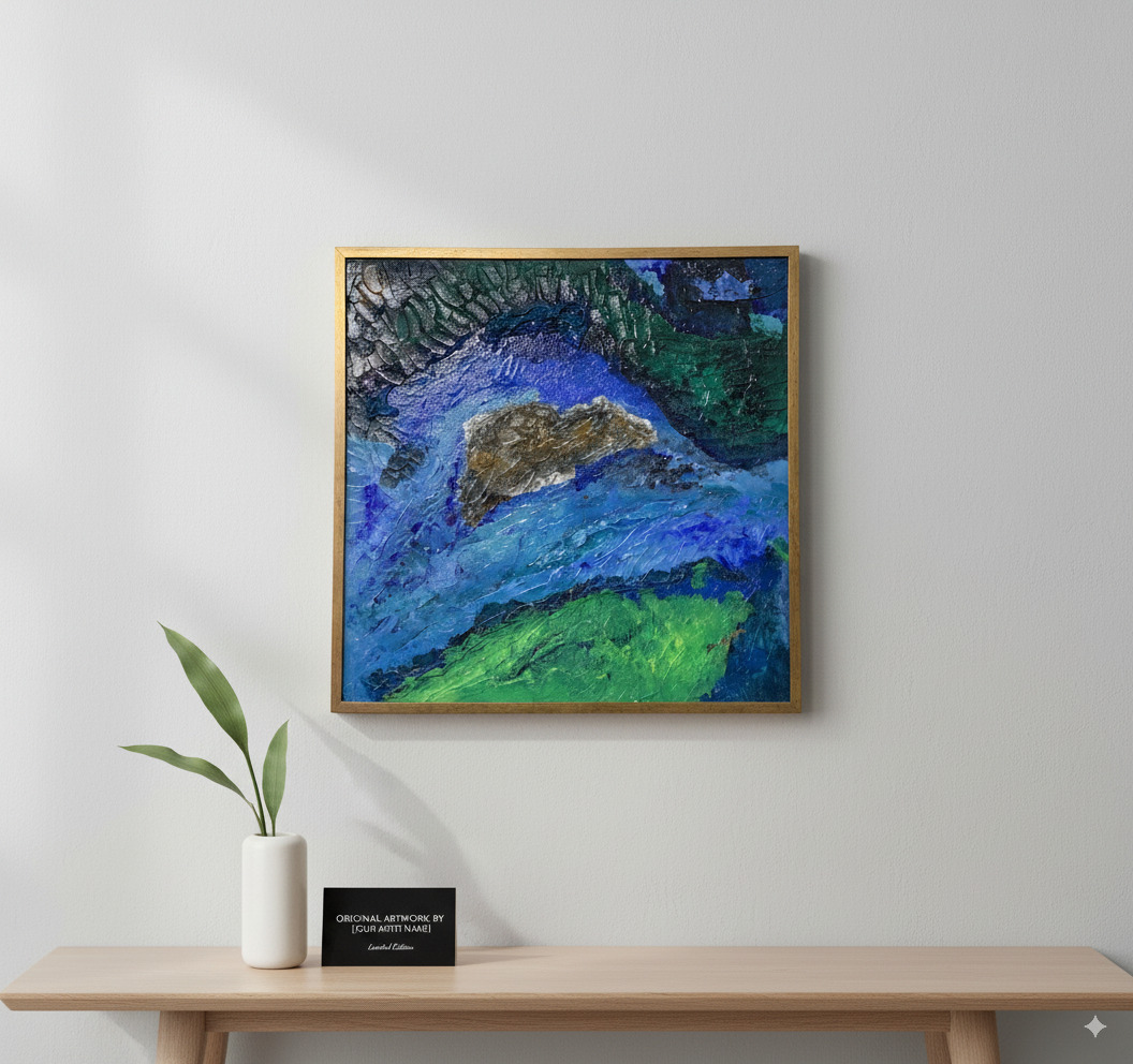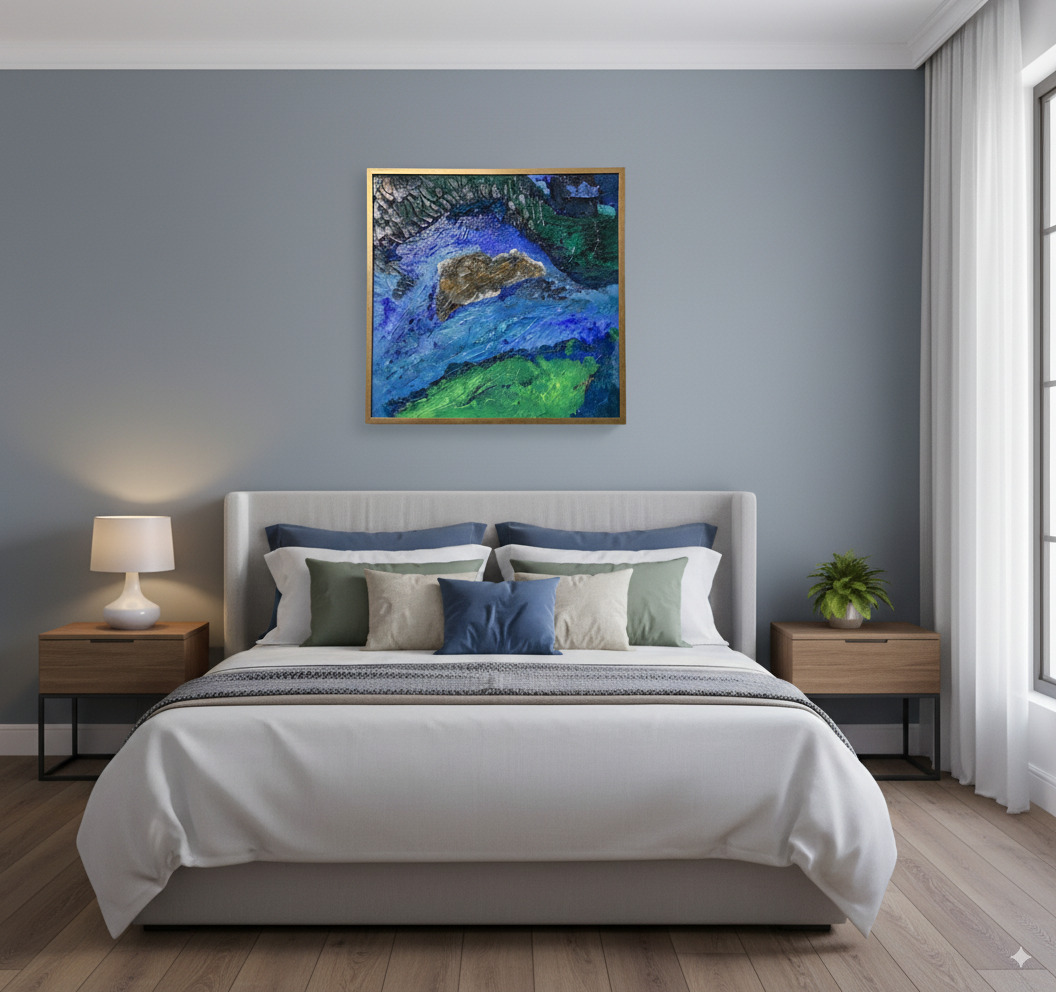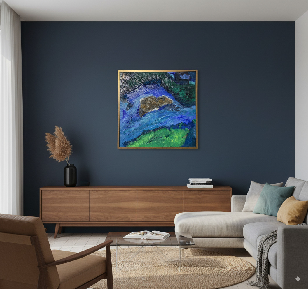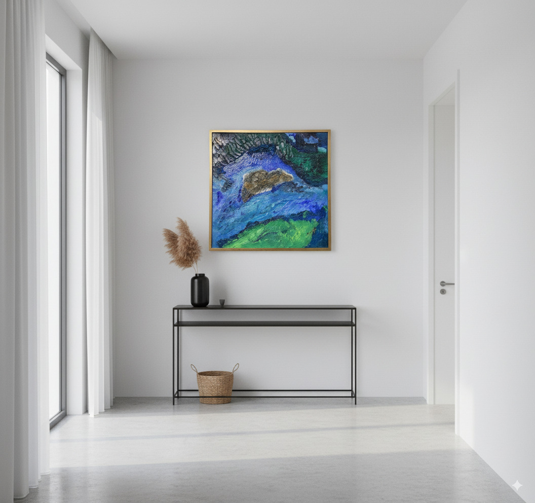 Dive into the depths of “Terraqueous,” an original abstract painting that offers a tactile and visual journey. Inspired by an aerial view of a hidden coastline, this painting captures the raw energy of nature. Layers of thick, sculpted paint create a three-dimensional landscape, where waves of brilliant blue crash against shores of vivid green and a central, earth-toned island. The light catches every peak and valley of the textured surface, making the painting come alive and change throughout the day.