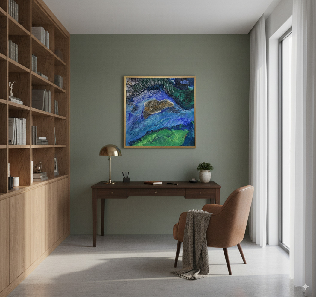 The rich color palette and elegant gold frame make this a remarkably versatile piece. It serves as a stunning focal point in a modern living room, brings a calming, natural element to a bedroom, or adds a touch of sophistication to a home office or hallway. It pairs beautifully with both dark, moody wall colors like navy or charcoal, and clean, minimalist white walls where its colors can truly pop.